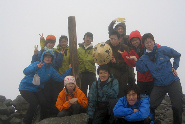 武蔵美ワンダーフォーゲル部の合宿。前列中央(グリーンのジャケット)が私市さん。